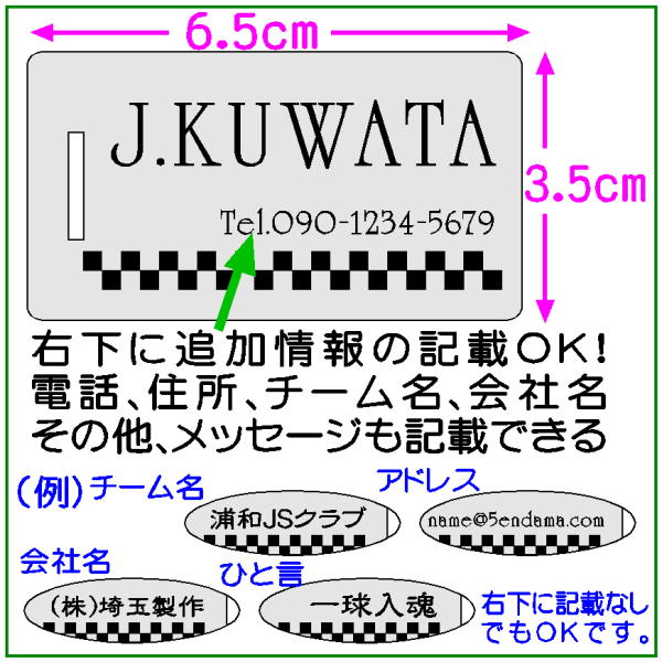 名前だけでなく、電話番号や住所、チーム名など何でも刻印OK。