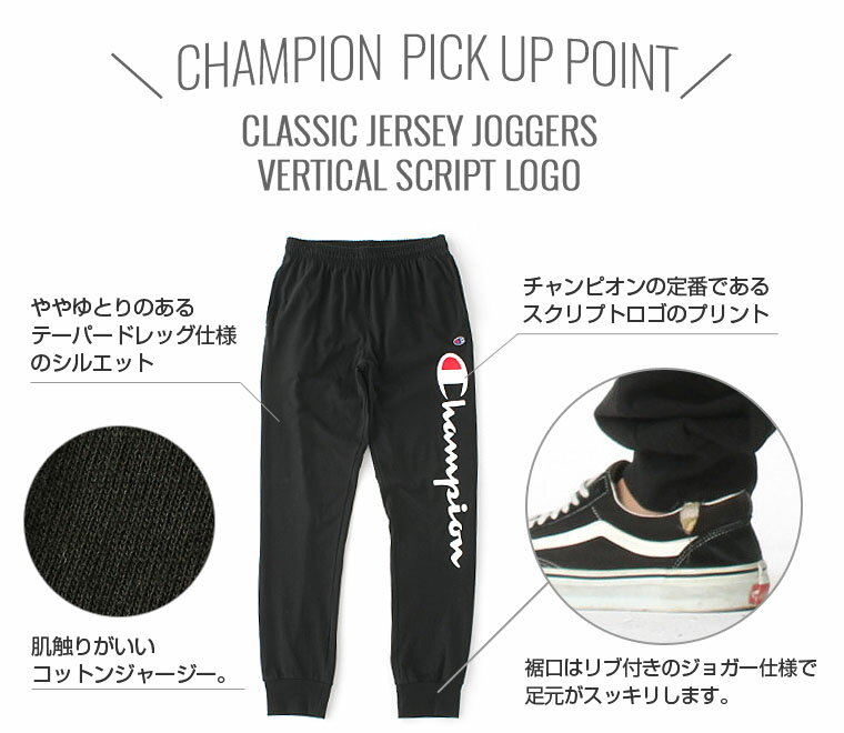 ⇒Champion(チャンピオン)特集はコチラ【アイテム解説】Champion Men's Classic Jersey Joggers, Vertical Script Logo1919年にニューヨーク州チェスターで誕生したchampion(チャンピオン)は、デザイン・機能性・素材・縫製・価格と、全てに対してハイパフォーマンスでアスリートからストリートまで納得できるアイテムを提供し続けています。