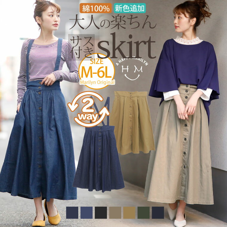 大きいサイズ レディース スカート | 新色追加!! コットン100% 2way 大人の楽ちん 美シルエット デニム ツイル サスペンダー付き フレアロングスカート _ オリジナル ロング丈スカート LL 3L 4L 5L 6L [448029A/448029B] OMMBT ぽっちゃり ゆったり 春 春物 春服